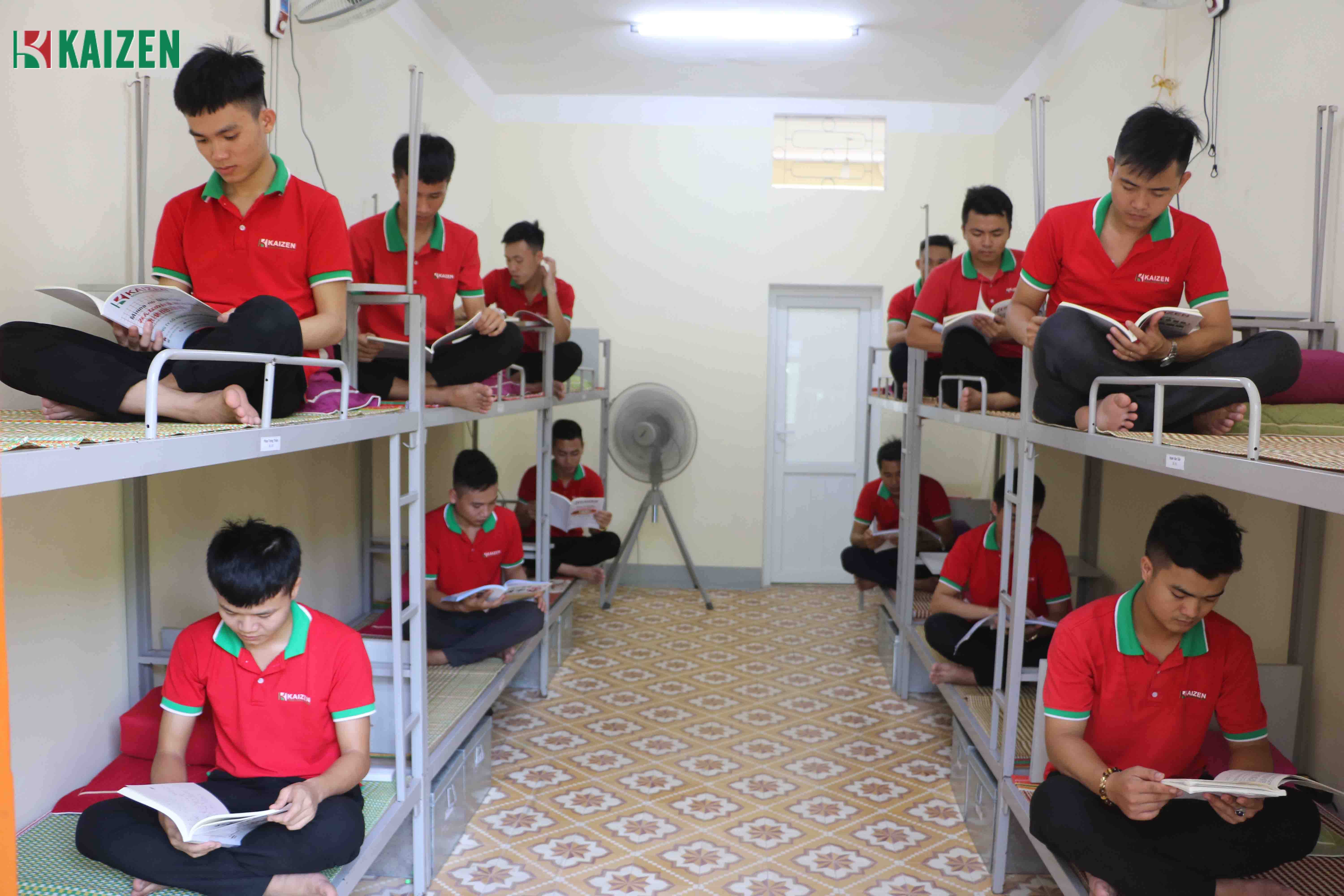 Ngoài ra, Công ty Kaizen còn xây dựng quy chế học tập cũng như sinh hoạt kỷ luật cho học viên. Theo đó khi đăng ký chương trình xuất khẩu lao động hay du học ở Kaizen các bạn học viên phải ở tập trung trong khu ký túc xá của công ty. Nhờ vậy, công ty có thể quản lý tất cả giờ giấc của học viên một cách kỷ luật và nghiêm ngặt. Điều này không chỉ giúp các em xây dựng một lối sống lành mạnh mà còn tạo cho học viên những thói quen tốt để khi sang nước bạn không bị bỡ ngỡ. Đây chính là một bước tiến lớn trong công tác quản lý, đào tạo học viên của công ty.