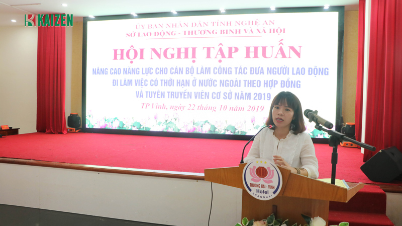 Tiếp nối buổi lễ bà Trịnh Thị Huyên – Chủ tịch hội đồng quản trị kiêm Tổng Giám đốc công ty CPQT KaiZen chia sẻ: Công ty Kaizen rất vinh dự khi trở thành đơn vị duy nhất được Sở LĐ - TB&XH mời tham dự buổi tập huấn. Trong thời gian qua công ty Kaizen đã tổ chức nhiều chương trình tuyên truyền, cung cấp thông tin XKLĐ đến người lao động. Đồng thời công ty cũng có nhiều chế độ ưu đãi, hỗ trợ cho những lao động ở vùng sâu, vùng xa, vùng bãi ngang tại tỉnh Nghệ An có điều kiện đi XKLĐ. Trong thời gian tới Kaizen mong muốn được tiếp tục đồng hành với Sở LĐ – TB&XH trong việc hỗ trợ người lao động đi làm việc tại nước ngoài để nâng cao thu nhập.